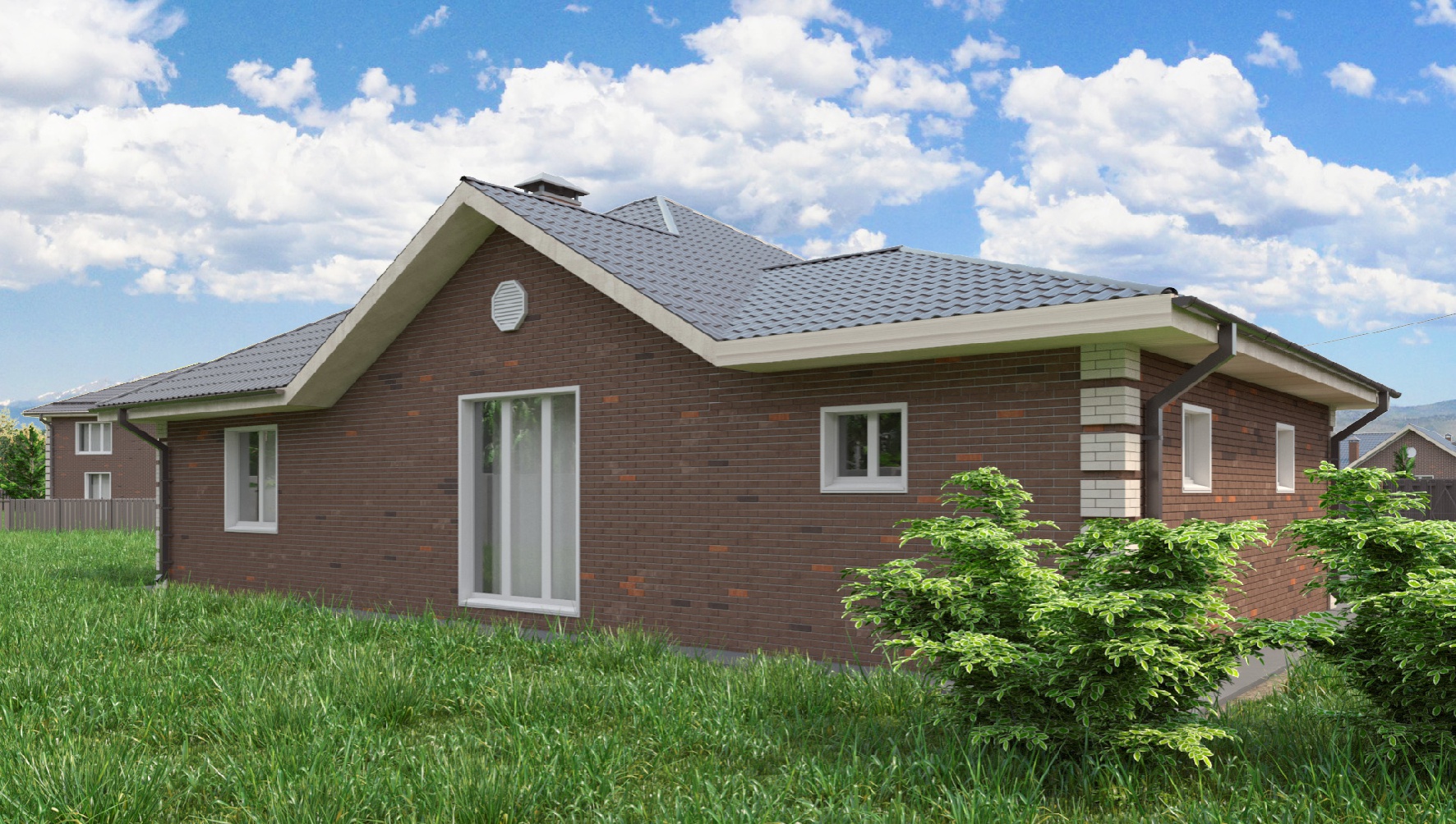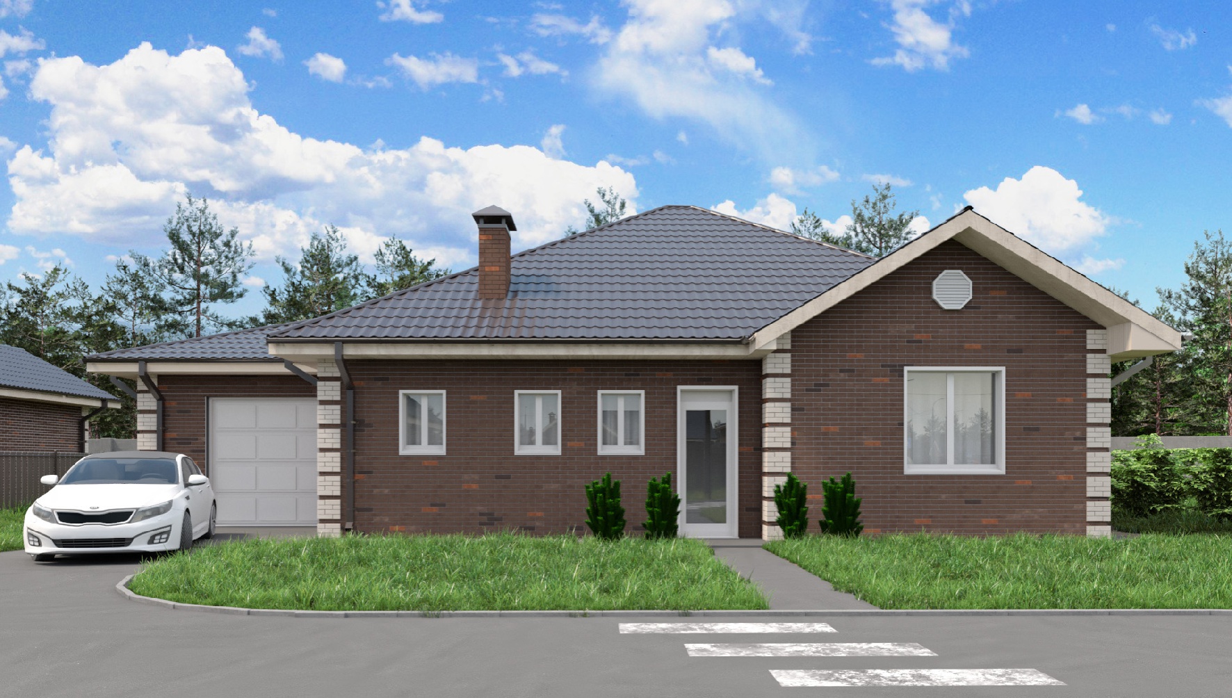 Одноэтажный дом площадью 147 кв. м.с просторной гостиной и тремя спальнями. Рядом с выходом из прихожей два санузла, а сразу за ними — выход в одноместный гараж 31 кв. м., где можно хранить не только автомобиль, но и инструменты, самокаты, велосипеды и много других полезных вещей.