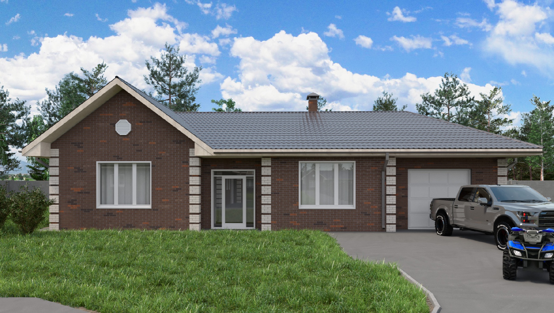 Одноэтажный дом площадью 161 кв. м., где есть все для комфортной жизни большого семейства с детьми. Три спальни, два санузла, все комнаты выходят в общий коридор. Просторный вход в гостиную с кухней. Встроенный гараж на две машины площадью 40 кв. м., выйти в него можно прямо из дома. В прихожей и коридоре предусмотрено место для полезной организации пространства, установки шкафов.