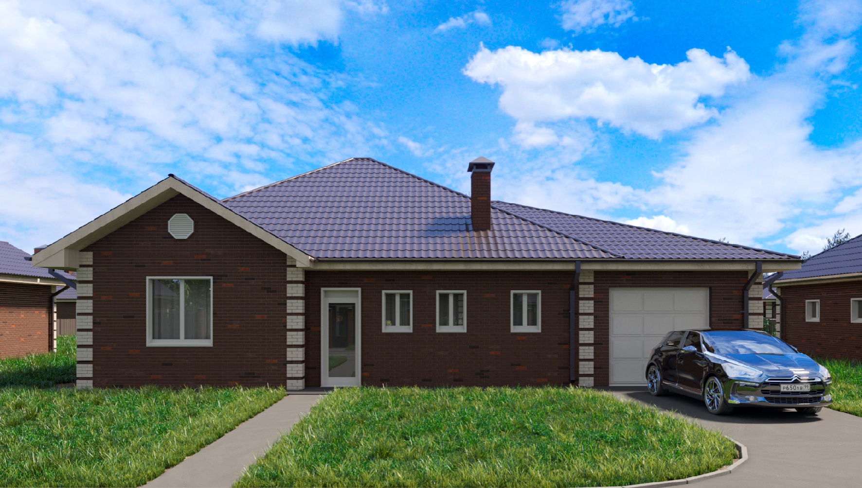 Одноэтажный дом площадью 158 кв. м. с удобной и простой планировкой. Три спальни, два санузла (один из них с ванной 2,1 м.), просторная кухня-гостиная, прихожая с местом для хранения вещей. В конце коридора выход в большой гараж на две машины (41,4 кв. м.).