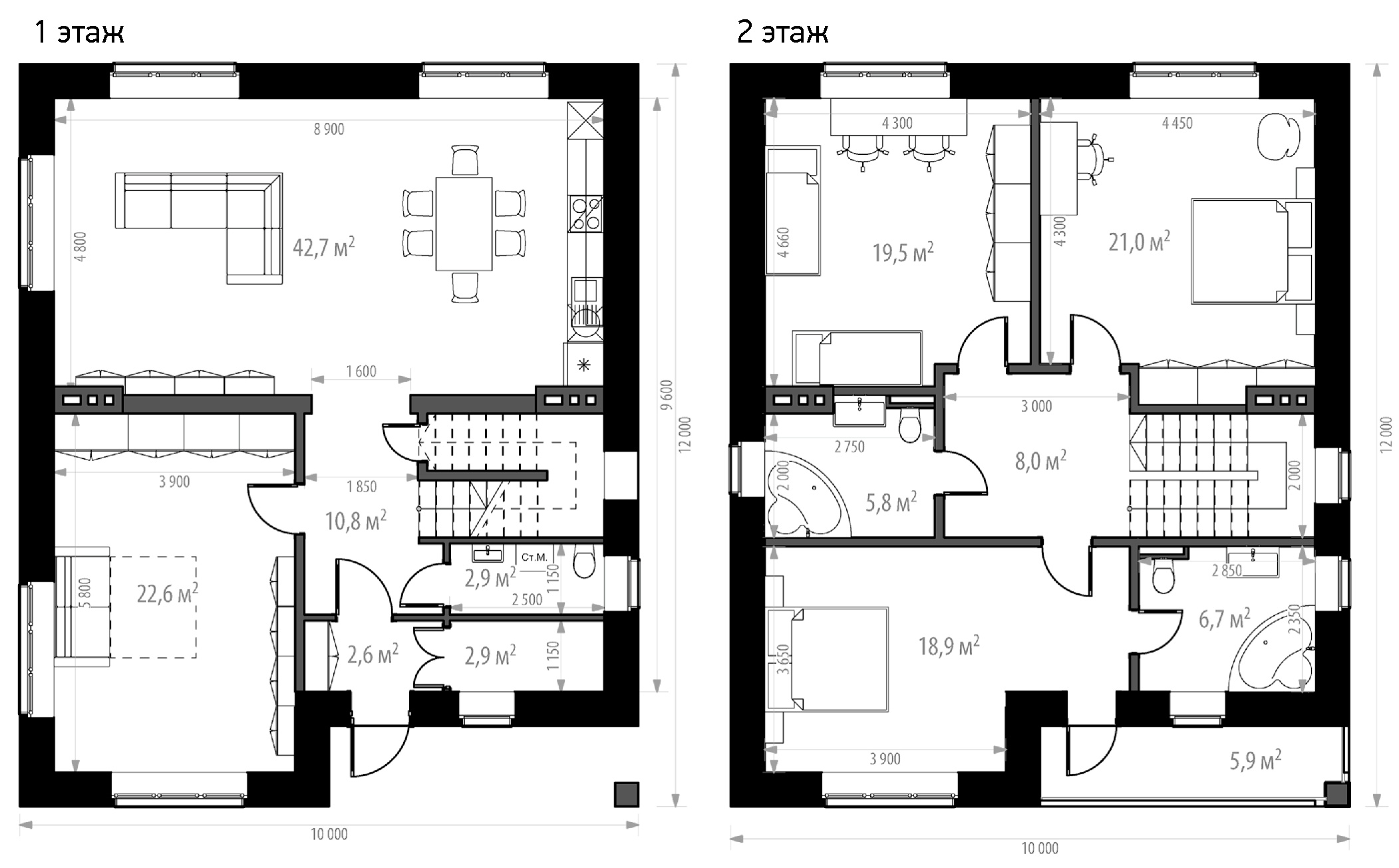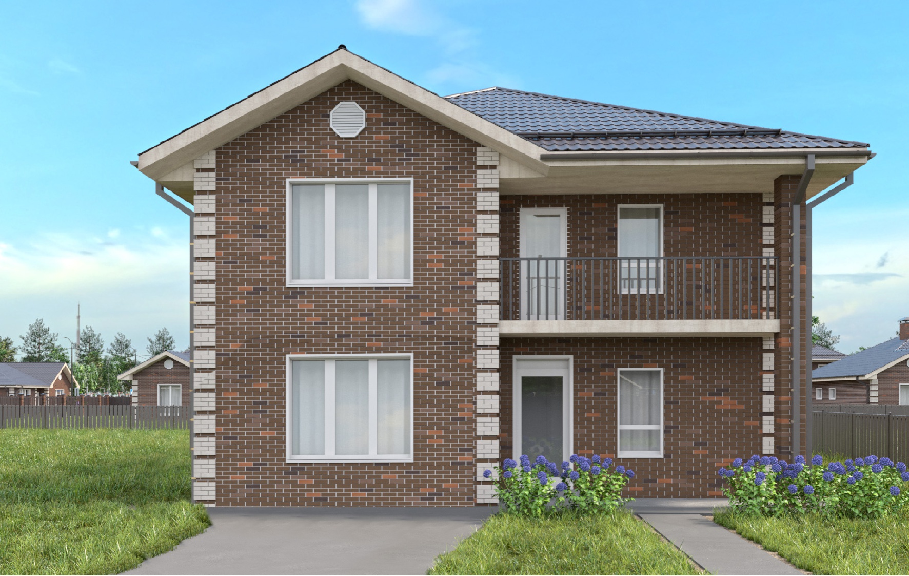 Двухэтажный дом площадью 170 кв. м. На первом этаже прихожая с гардеробной, санузел, гостиная с кухней и комната для гостей. На втором этаже три спальни (одна из них с отдельной ванной и выходом на лоджию), а также общий санузел. Все комнаты просторные и светлые. Уютный дом для большой, гостеприимной семьи с детьми.