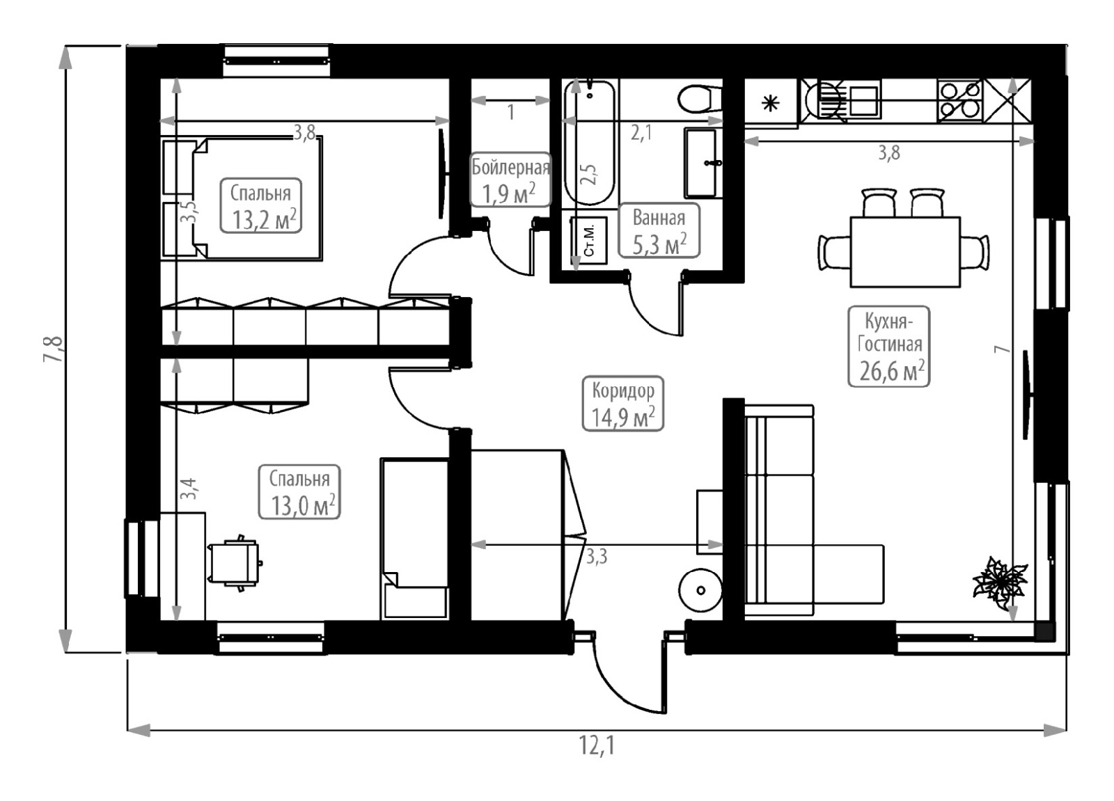 Одноэтажный дом площадью 75 кв. м. Две спальни 13,2 и 13 кв. м, светлая гостиная с кухней с большими окнами, просторная прихожая с местом для хранения вещей. Напротив входа общий санузел, рядом небольшая комната — можно использовать как кладовую или гардеробную. Уютный дом для небольшой семьи с удобной планировкой — идеально для спокойной загородной жизни.