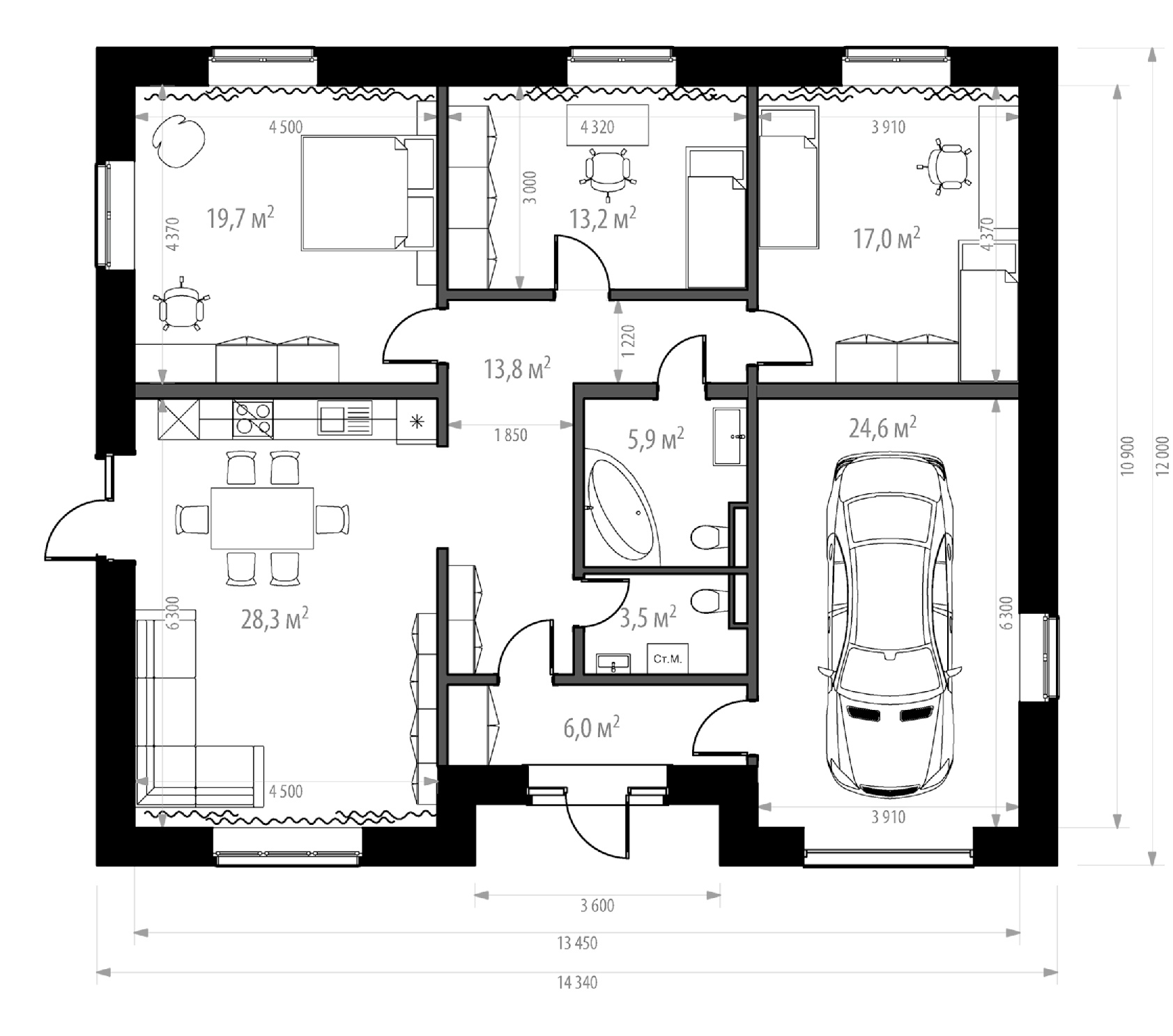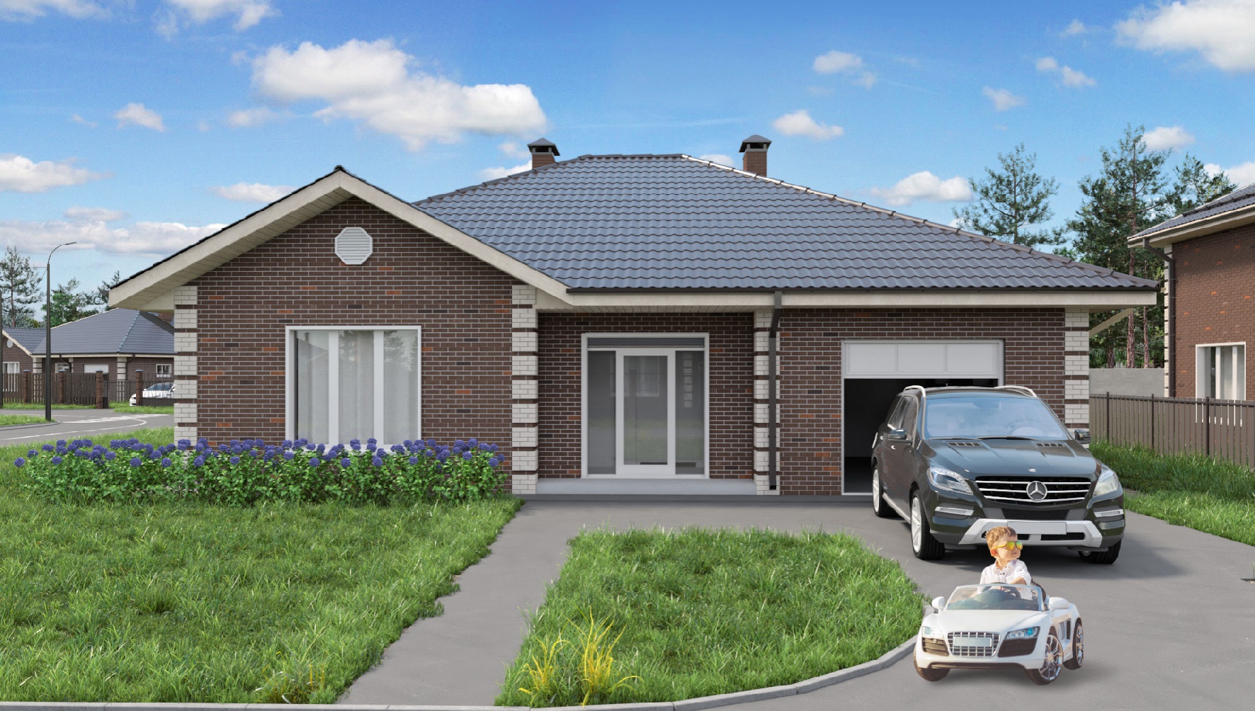 Одноэтажный дом общей площадью 135 кв. м. Идеально для большой семьи — три просторных спальни, два санузла, кухня с гостиной 28 кв.м. Встроенный гараж на одну машину. Все комнаты изолированные с выходом в просторный коридор. Невероятно уютный и светлый дом с большими окнами для комфортной семейной жизни за городом.