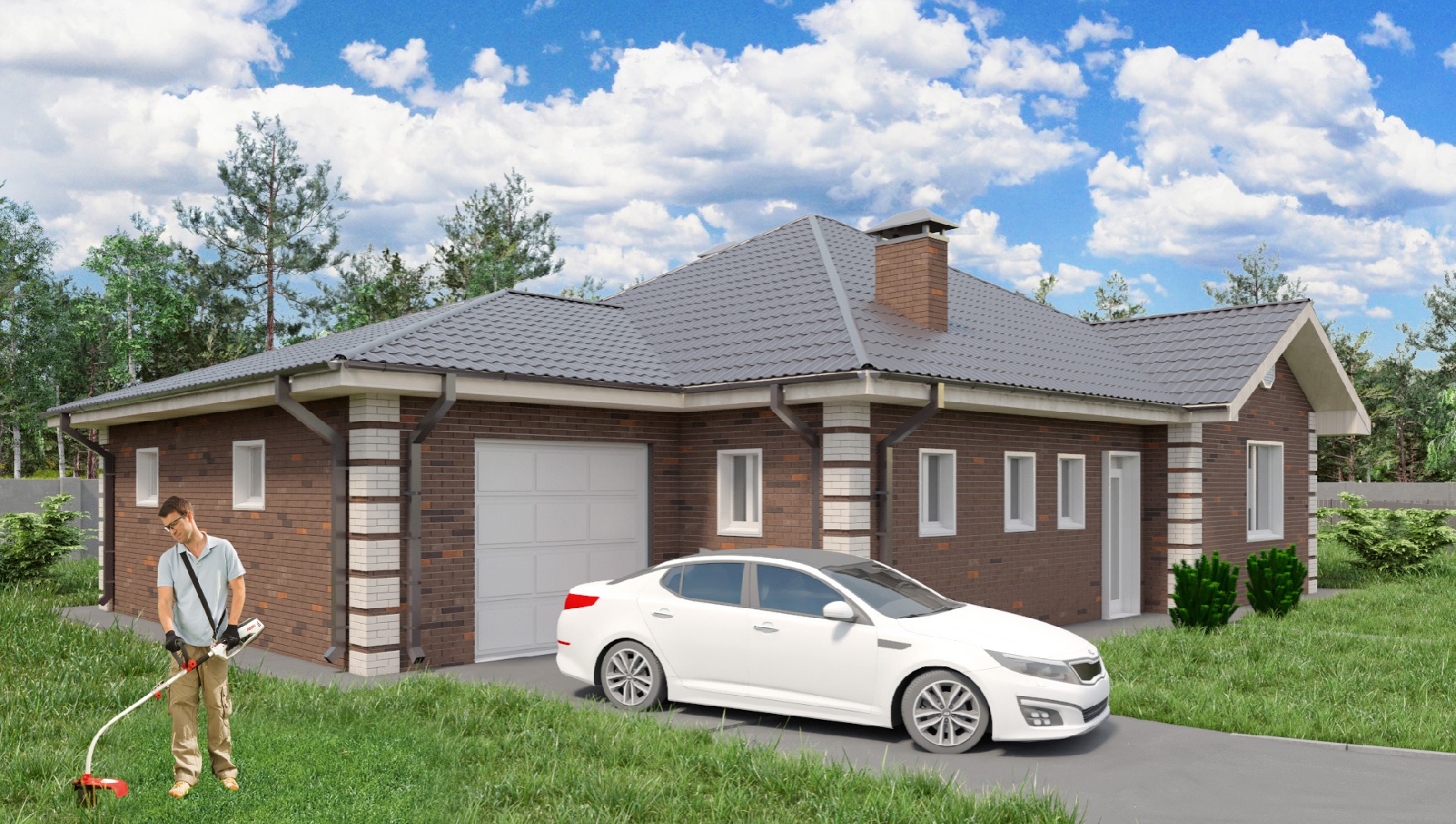 Одноэтажный дом площадью 147 кв. м.с просторной гостиной и тремя спальнями. Рядом с выходом из прихожей два санузла, а сразу за ними — выход в одноместный гараж 31 кв. м., где можно хранить не только автомобиль, но и инструменты, самокаты, велосипеды и много других полезных вещей.