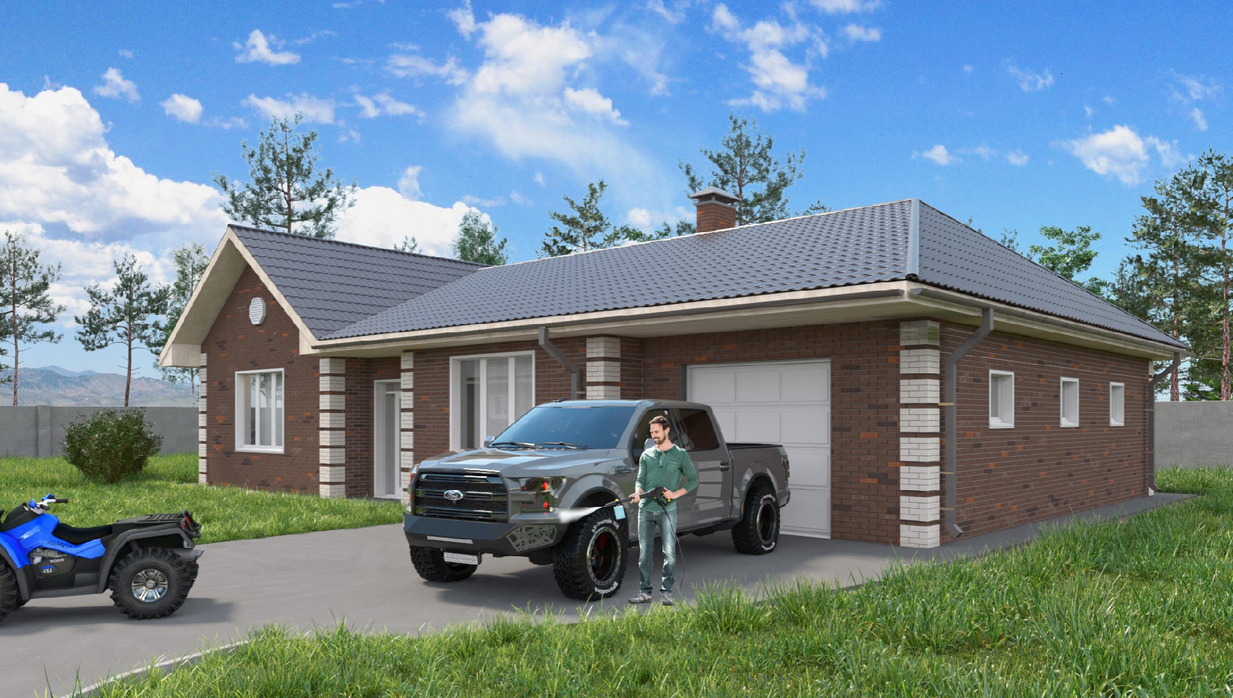 Одноэтажный дом площадью 161 кв. м., где есть все для комфортной жизни большого семейства с детьми. Три спальни, два санузла, все комнаты выходят в общий коридор. Просторный вход в гостиную с кухней. Встроенный гараж на две машины площадью 40 кв. м., выйти в него можно прямо из дома. В прихожей и коридоре предусмотрено место для полезной организации пространства, установки шкафов.