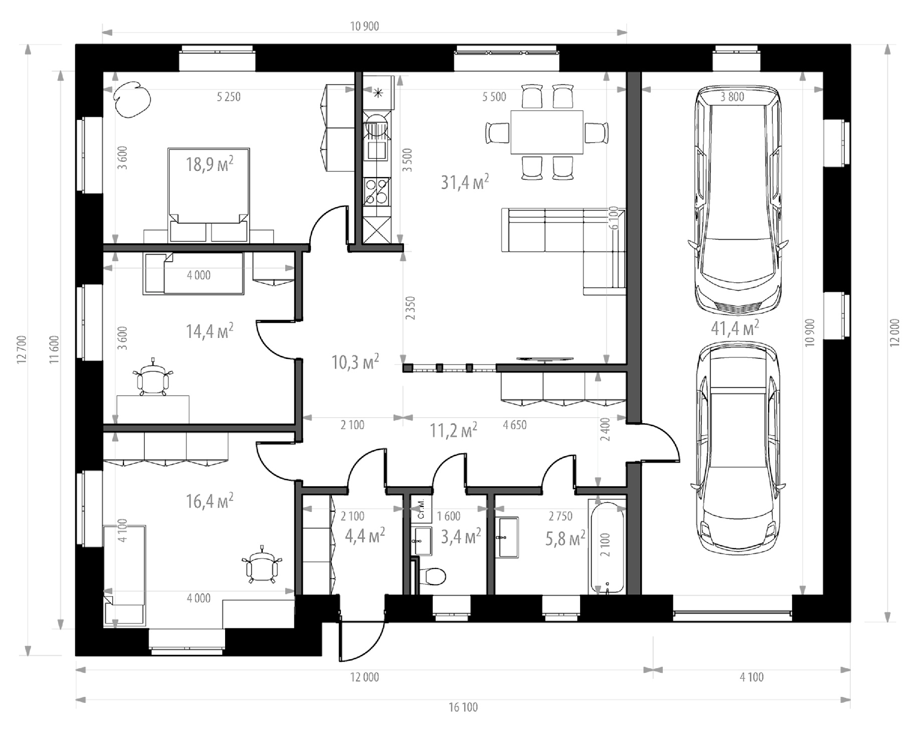 Одноэтажный дом площадью 158 кв. м. с удобной и простой планировкой. Три спальни, два санузла (один из них с ванной 2,1 м.), просторная кухня-гостиная, прихожая с местом для хранения вещей. В конце коридора выход в большой гараж на две машины (41,4 кв. м.).