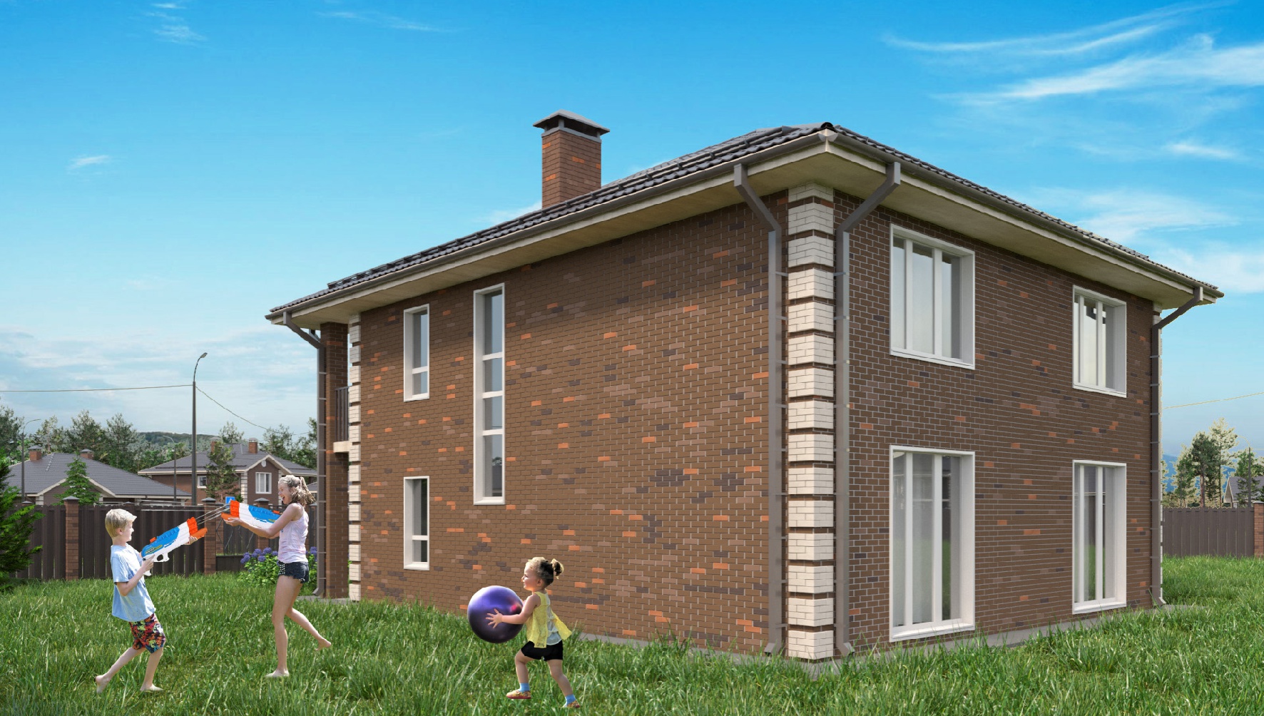 Двухэтажный дом площадью 170 кв. м. На первом этаже прихожая с гардеробной, санузел, гостиная с кухней и комната для гостей. На втором этаже три спальни (одна из них с отдельной ванной и выходом на лоджию), а также общий санузел. Все комнаты просторные и светлые. Уютный дом для большой, гостеприимной семьи с детьми.