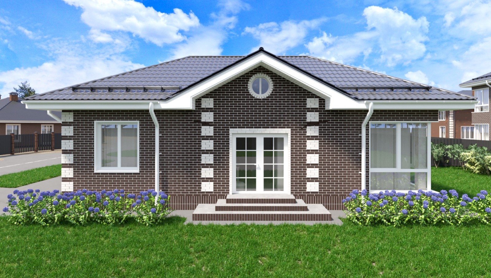 Одноэтажный дом площадью 75 кв. м. Две спальни 13,2 и 13 кв. м, светлая гостиная с кухней с большими окнами, просторная прихожая с местом для хранения вещей. Напротив входа общий санузел, рядом небольшая комната — можно использовать как кладовую или гардеробную. Уютный дом для небольшой семьи с удобной планировкой — идеально для спокойной загородной жизни.